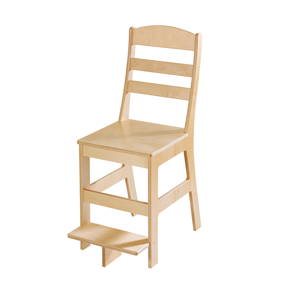 Klarlackad stol med avtagbart fortstöd för barn i skolåldern. Passar såväl vid elevbordet som vid vuxenbord. Sitthöjd 450 mm.